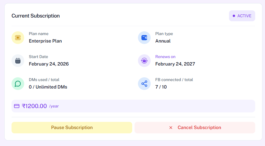 In addition to plan information, this section also displays usage and connection details, such as the number of Direct Messages (DMs) used compared to the allowed limit and how many Facebook pages are connected under your plan. The subscription status indicator shows whether your plan is currently active. You will also find management options such as Pause Subscription and Cancel Subscription. Pausing the subscription temporarily limits access to certain features, while canceling the subscription stops future renewals, although the plan will remain active until the end of the current billing cycle.